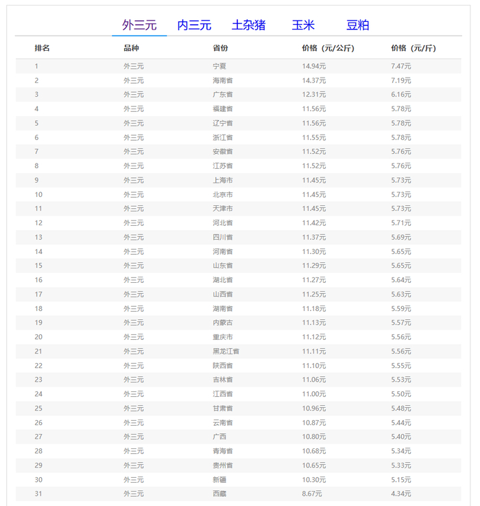外三元排行前三:寧夏回族自治區14.94元/公斤、海南省14.37元/公斤、廣東省12.31元/公斤;