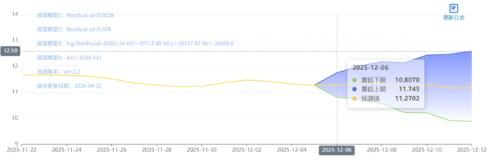 玄田算法是由項目課題組團隊原創的非經典邏輯數值聚合理論和不確定性預測方法,構建了基于一致模算子的生豬價格預測模型。該模型采用的聚合函數及一致模相關理論與方法已獲得多項國家自然科學基金和省級自然科學資金資助,并獲得多項省級自然科學獎獎項。12月06日預測豬價為11.2702,置信區間在10.8070--11.745之間。12月07日預測豬價為11.3555;12月08日預測豬價為11.3584。