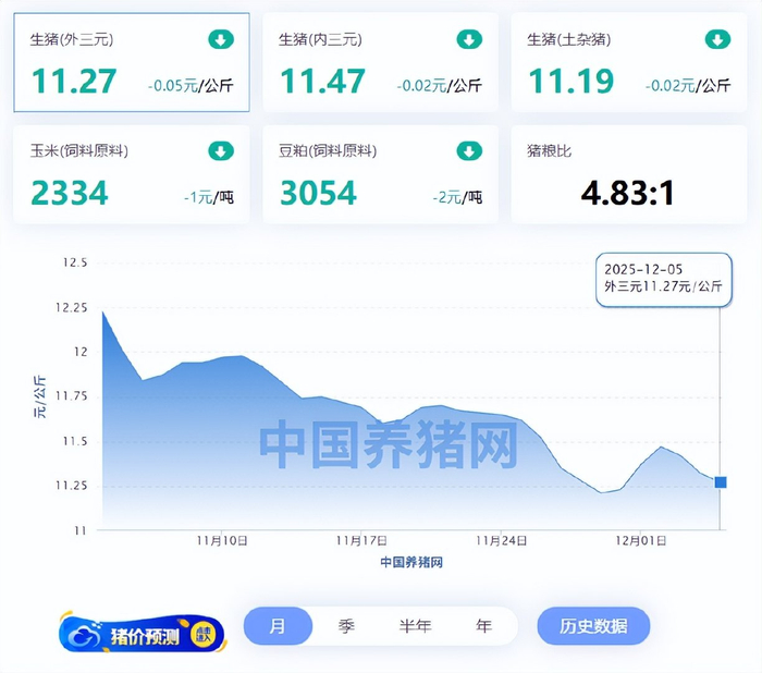 全國(生豬品種:外三元)均價為11.27元/公斤,豬價較昨日下跌0.05元/公斤,環比下跌6.16%,同比下跌29.34%;