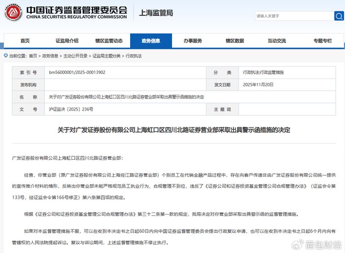 11月20日,上海證監局披露對廣發證券股份有限公司上海虹口區四川北路證券營業部采取出具警示函措施的決定(滬證監決〔2025〕236號)。
