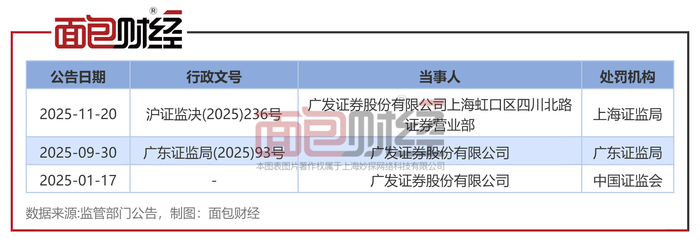 分析發現,廣發證券在2025年已收到多張監管罰單。