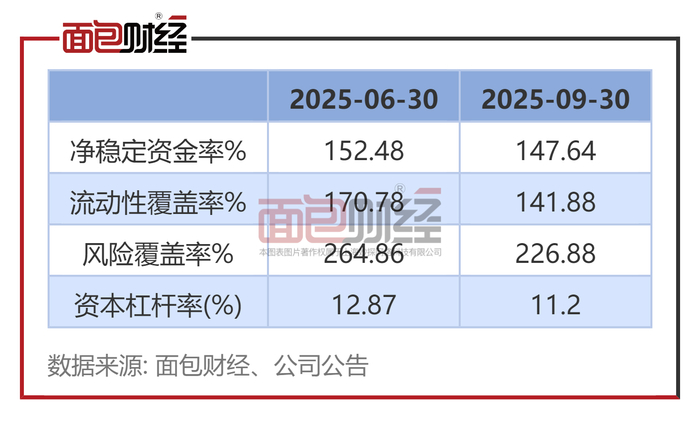 數據顯示,2025年三季度,公司的風險覆蓋率為226.88%,較2025年6月末下滑37.98個百分點;流動性覆蓋率為141.88%,較2025年6月末下降28.9個百分點;凈穩定資金率為147.64%,較2025年6月末下滑4.84個百分點;資本杠桿率為11.2%,較2025年6月末下滑1.67個百分點。