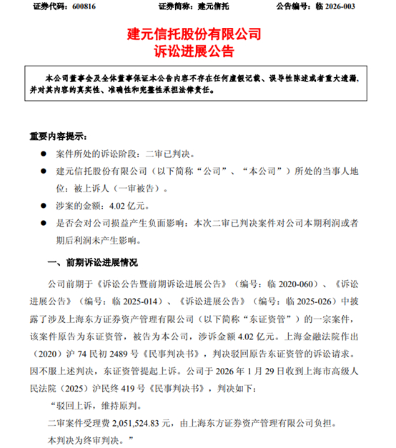 2026年1月30日,建元信托發布訴訟進展公告,公告顯示,建元信托于2026年1月29日收到上海市高級人民法院(2025)滬民終419號《民事判決書》,該案件原告為上海東方證券資產管理有限公司(下稱“東證資管”),被告為建元信托(原安信信托)。判決顯示,“駁回上訴,維持原判。二審案件受理費205.15萬元,由上海東方證券資產管理有限公司負擔。本判決為終審判決。”