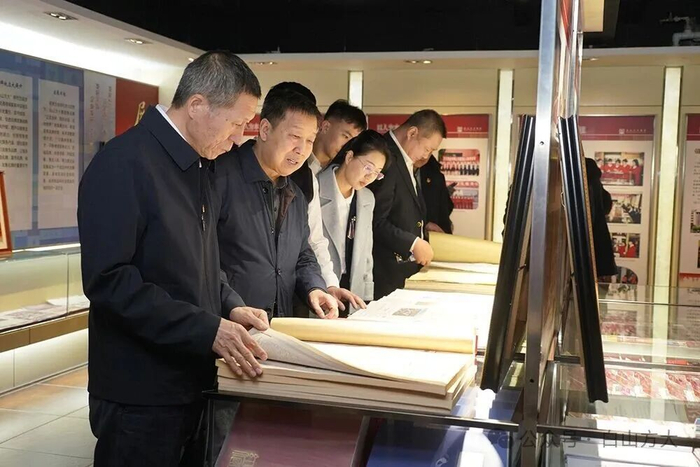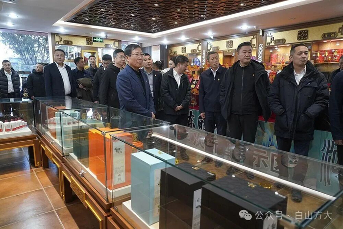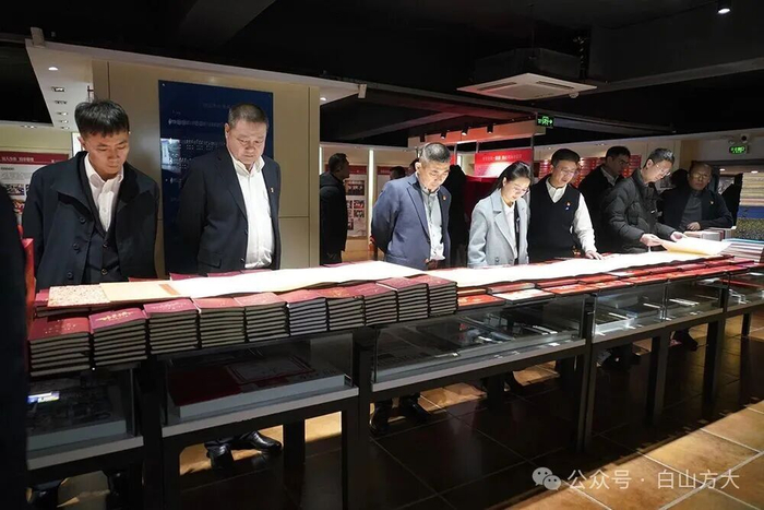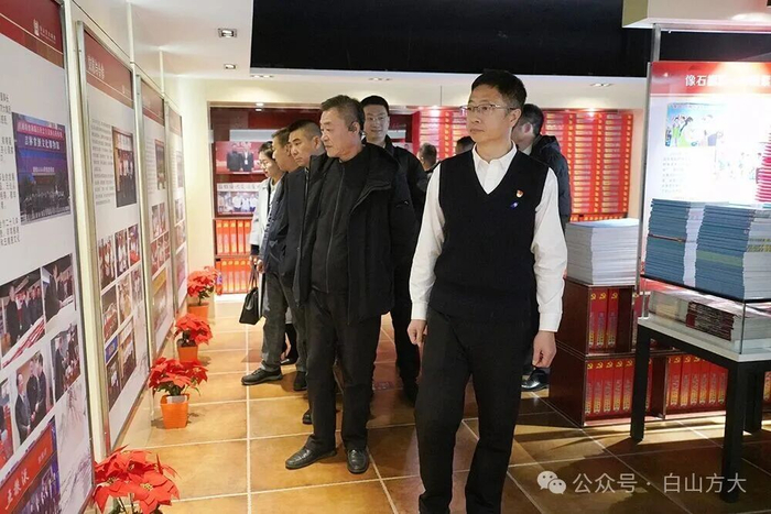 在三樓黨建文化基地,南航吉林分公司的領導和同志們通過觀看榮譽墻上懸掛的企業多年來榮獲的國家級、省級榮譽和珍藏著黨和國家、吉林省、白山市以及白山方大各項重大活動的紅色檔案,詳細了解白山方大集團一路走來所經歷的非凡歷程。