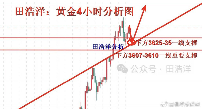 從4小時分析來看,下方支撐關注3625-33附近,日內回踩依托此位置繼續主多順勢看漲不變,短期多頭強勢分界線3600關口,日線級別企穩此位置上方繼續保持回踩低多順勢看漲節奏。操作上以回踩做多為主。具體操作策略我會在盤中提示,及時關注。