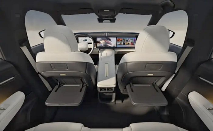 新車采用環抱式座艙布局,配備獨立液晶儀表與中控+副駕一體式雙聯屏,理想汽車的相似感。雙輻平底方向盤搭配懷擋換擋,更簡潔。車內有金色裝飾和隱私玻璃,深淺撞色設計,副駕駛電動腿托和二排折疊桌等等。