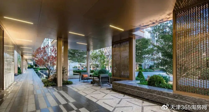 鳳起悅鳴歸家大堂利用半隱照壁和入口灰空間與南開二馬路保持一定的距離,避免社區(qū)內外的直接對視,隔絕都市的喧囂。