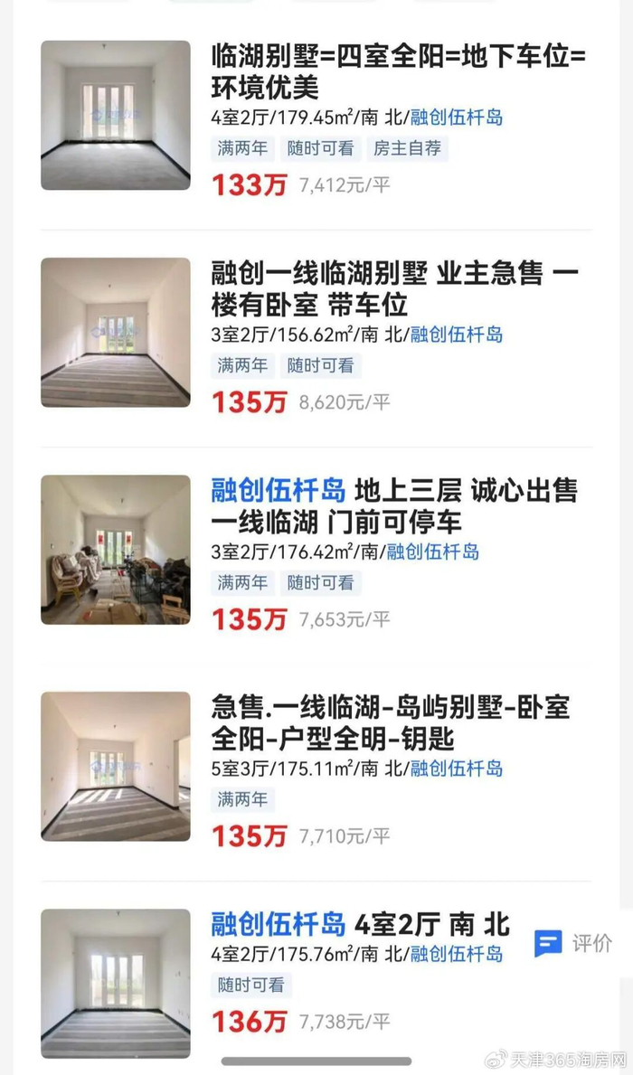 像融創(chuàng)伍仟島的聯(lián)排別墅179平米掛牌價130多萬。