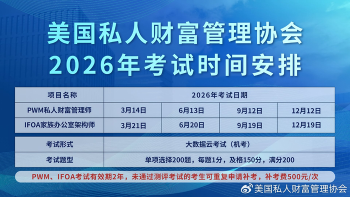 2026年3月9日9:00至3月15日22:00,考生可通過美國私人財富管理協會北京代表處網上報名系統提交報名信息,網址:www.pwma.org.cn,點擊考試報名入口,注冊、填寫報名信息并按要求上傳照片、身份證、學歷證等資料。自行選擇申報級別,點擊確認信息,提交完畢自動生成準考證,在報名記錄下載準考證。認真閱讀準考證考試須知,按要求規范參加考試。