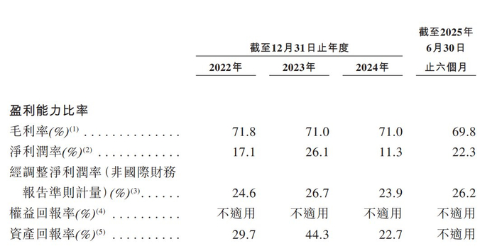 于2022年度、2023年度、2024年度及2025年截至9月30日止九個月,公司毛利率分別為71.8%、71.0%、71.0%及69.8%。