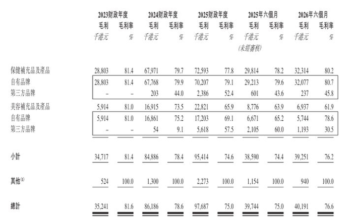 令人意外的是,在2023至2025財年公司整體毛利率從81.6%下滑至75.0%的背景下,保健補充品業務在2026財年上半年(即截至2025年9月30日止六個月)展現出了強勁的反彈能力。數據顯示,該板塊毛利率從2025財年的77.8%回升至80.2%,甚至超越了2024財年79.7%的水平。其中,自有品牌保健品的毛利率更是從2025財年的79.1%反彈至80.7%,基本收復失地。