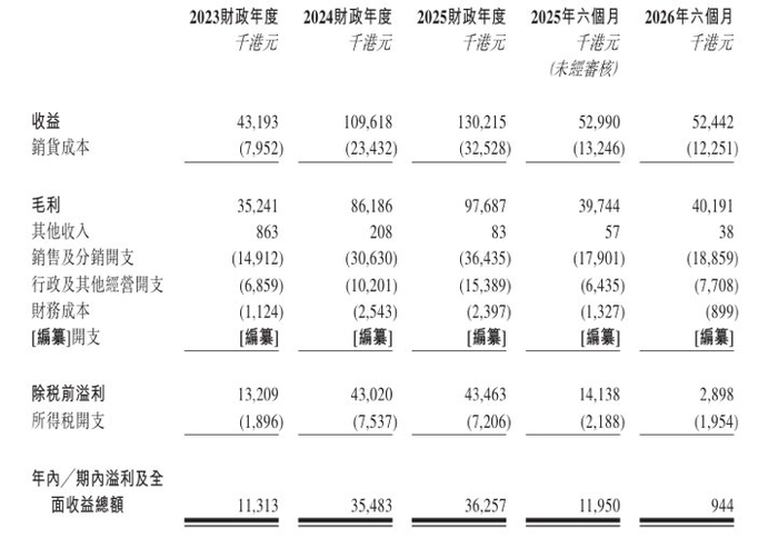 然而,一個值得警惕的財務信號是:營收的高速增長并未轉化為同等比例的利潤增長,甚至出現了嚴重的背離。在2023至2025三個完整財年內,公司的年內溢利分別為1131.3萬港元、3548.3萬港元及3625.7萬港元。表面上看,利潤絕對值在增長,但若計算凈利潤率,則分別為26.2%、32.2%和27.8%,2025財年已出現下滑趨勢。