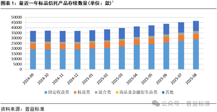 截至2025年8月末,共有65家信托公司存續46592款標品信托產品,存續數量環比增加1315款,升幅為2.90%。