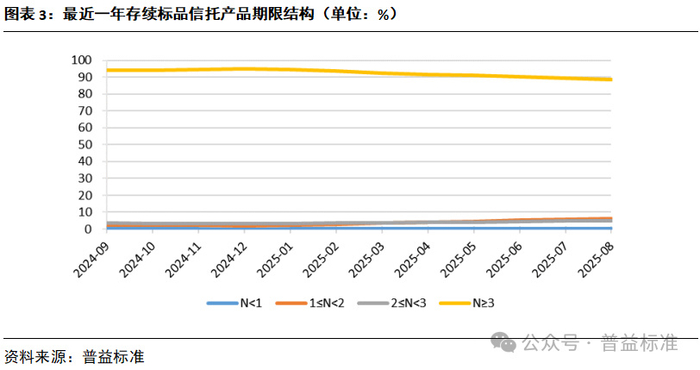 從產品期限看,截至2025年8月末存續且披露了期限的44014款標品信托產品中,1年期(不含)以下產品64款,占比0.15%,環比上升0.01%;1年期至2年期(不含)產品2678款,占比6.08%,環比上升0.39%;2年期至3年期(不含)產品2247款,占比5.11%,環比上升0.31%;3年期以上產品39025款,占比88.66%,環比下降0.71%。