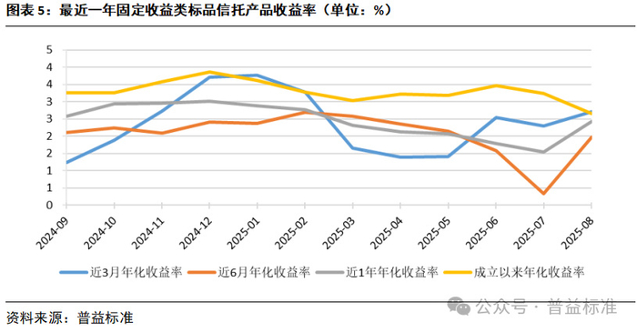 截至2025年8月末,固定收益類標品信托產品的近3月年化收益率均值為2.71%,環比上升0.41%;近6月年化收益率均值為1.98%,環比上升1.65%;近1年年化收益率均值為2.42%,環比上升0.89%;成立以來年化收益率均值為2.66%,環比下降0.58%。