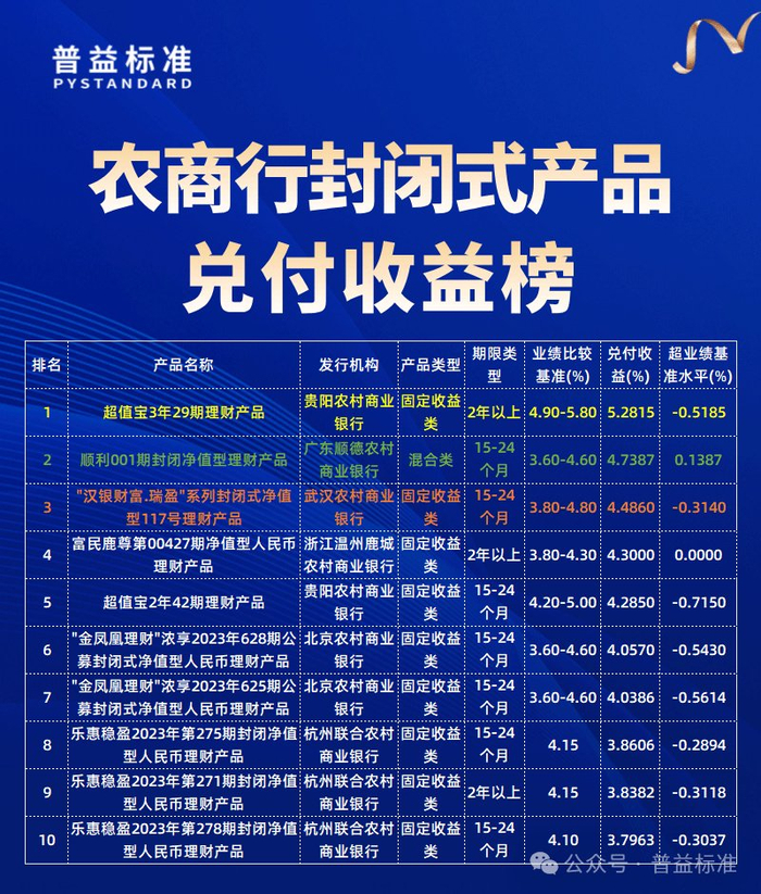 農(nóng)商行實際兌付收益榜中,排名第一的是貴陽農(nóng)村商業(yè)銀行的“超值寶3年29期理財產(chǎn)品”,第二名是廣東順德農(nóng)村商業(yè)銀行的“順利001期封閉凈值型理財產(chǎn)品”,第三名是武漢農(nóng)村商業(yè)銀行的“"漢銀財富.瑞盈"系列封閉式凈值型117號理財產(chǎn)品”。