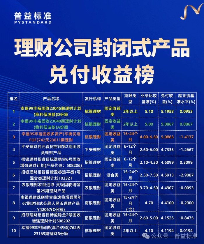 理財公司實際兌付收益榜中,兌付收益率(年化)最高為5.1953%,為“幸福99豐裕固收23045期理財計劃(穩(wěn)利低波款)D份額”,杭銀理財?shù)摹靶腋?9豐裕固收23040期理財計劃(穩(wěn)利低波款)A份額”以實際兌付收益率(年化)5.0867%排名第二,杭銀理財?shù)摹靶腋?9豐裕固收多資產(chǎn)(平衡優(yōu)選FOF)742天23011期理財”以實際兌付收益率(年化)5.0863%排名第三。