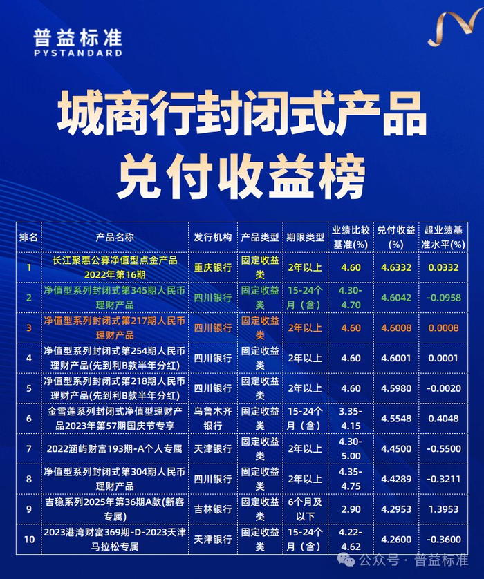 城商行實際兌付收益榜中,重慶銀行的“長江聚惠公募凈值型點金產(chǎn)品2022年第16期”以實際兌付收益率(年化)4.6332%排名第一,四川銀行的“凈值型系列封閉式第345期人民幣理財產(chǎn)品”排名第二,四川銀行的“凈值型系列封閉式第217期人民幣理財產(chǎn)品” 排名第三。