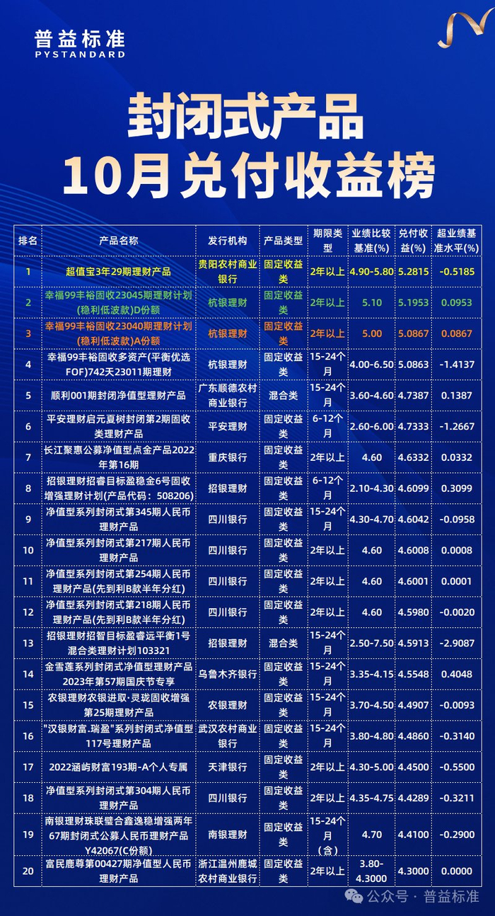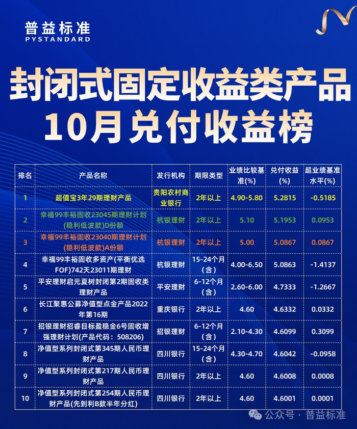 分產(chǎn)品類型來看,封閉式固定收益類產(chǎn)品10月兌付收益排行榜中,貴陽農(nóng)村商業(yè)銀行的“超值寶3年29期理財產(chǎn)品”排名榜首;杭銀理財?shù)摹靶腋?9豐裕固收23045期理財計劃(穩(wěn)利低波款)D份額”以實際兌付收益率(年化)5.1953%緊隨其后;杭銀理財?shù)摹靶腋?9豐裕固收23040期理財計劃(穩(wěn)利低波款)A份額”排名第三。