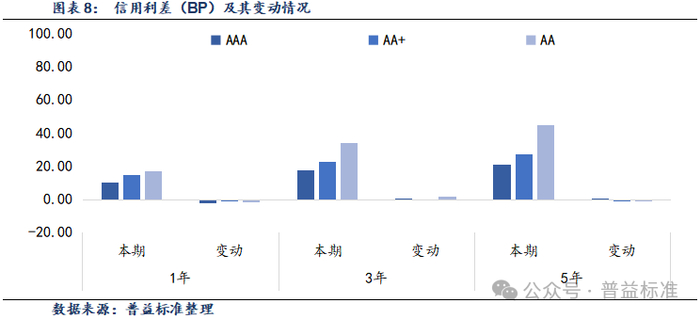 中短期票據信用利差[5]多數下降。我們將各期限各等級中債中短期票據收益率與對應期限的中債國開債到期收益率間的差異作為信用利差,本周AAA級1年期、3年期、5年期信用利差較上期分別變動-1.87BP、0.38BP、0.17BP;AA+級1年期、3年期、5年期信用利差較上期分別變動-1.10BP、-0.10BP、-0.90BP;AA級1年期、3年期、5年期信用利差較上期分別變動-1.38BP、1.84BP、-1.21BP。