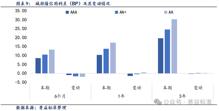 城投債信用利差[6]多數下降。本周AAA級6個月期、1年期、3年期信用利差較上期分別變動-0.91BP、-1.36BP、-0.16BP;AA+級6個月期、1年期、3年期信用利差較上期分別變動-1.61BP、-0.38BP、0.11BP;AA級6個月期、1年期、3年期信用利差較上期分別變動-1.90BP、0.51BP、0.10BP。