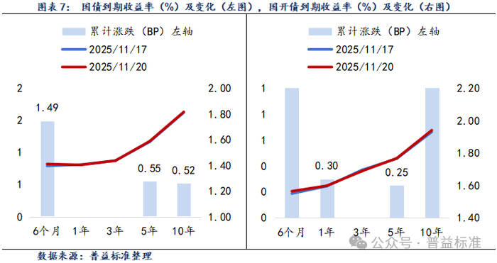 本周各期限利率債到期收益率[4]多數上升。從收益率曲線變化來看,本周6M、1Y、3Y、5Y、10Y國債到期收益率分別變動1.49BP、-0.23BP、-0.04BP、0.55BP、0.52BP;6M、1Y、3Y、5Y、10Y國開債到期收益率分別變動1.46BP、0.30BP、-0.71BP、0.25BP、1.04BP。從期限利差來看,國債10Y-1Y利差環比變動0.75BP,國開債10Y-1Y利差環比變動0.74BP。