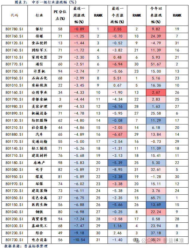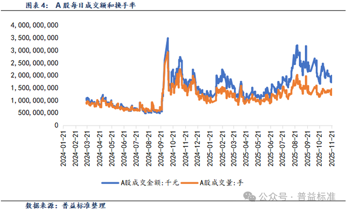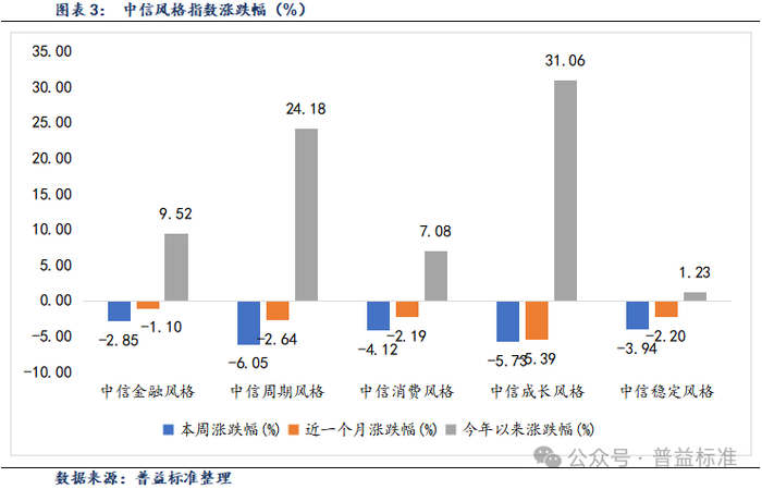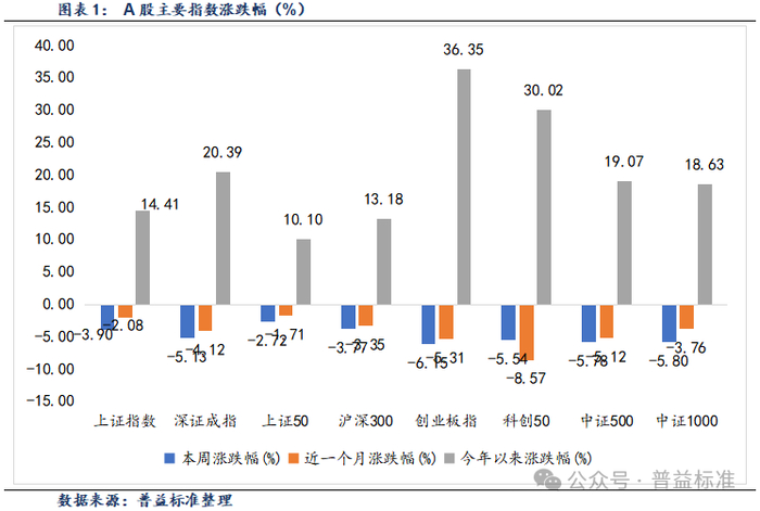 本周(2025/11/17-2025/11/21,下同)A股指數均下跌,債市主要指數多數下跌。周內各大主要指數表現為:上證指數下跌3.90%,深證成指下跌5.13%,創業板指下跌6.15%,科創50下跌5.54%。其他寬基指數方面:中證500指數下跌5.78%,中證1000指數下跌5.80%,滬深300指數下跌3.77%,上證50指數下跌2.72%。行業板塊方面,31個申萬一級行業中,所有板塊均下跌。跌幅最大的三個行業分別為基礎化工、綜合和電力設備,跌幅分別為-7.47%、-9.18%和-10.54%。風格指數均下降,金融風格、周期風格、消費風格、成長風格、穩定風格變動分別為-2.85%、-6.05%、-4.12%、-5.73%、-3.94%。每日成交金額和成交量方面,本周,平均每日成交額18650億元。