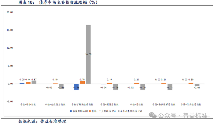 本周債市主要指數多數下跌。本周各主要指數具體表現如下:中債綜合指數變動0.05%,中債企業債指數變動-0.02%,中證可轉債總指數變動-1.78%,中債國債總指數變動-0.04%,中債總指數變動-0.02%,中債金融債總指數變動0.00%,中債信用債指數變動0.00%。