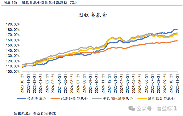 本周各固收類基金指數多數上漲。各類型固收類基金指數表現如下:短期純債基金指數變動0.02%,中長期純債型基金指數變動0.03%,債券指數型基金變動0.03%。