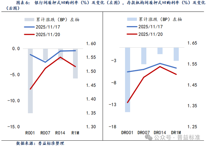 本周利率[1]均下跌,銀行間質押式回購利率1D、7D、14D、1M分別變動-12.39BP、-2.20BP、-2.22BP、-5.71BP,存款機構間質押式回購利率1D、7D、14D、1M[2]分別變動-14.67BP、-3.79BP、-1.51BP、-3.00BP[3]。