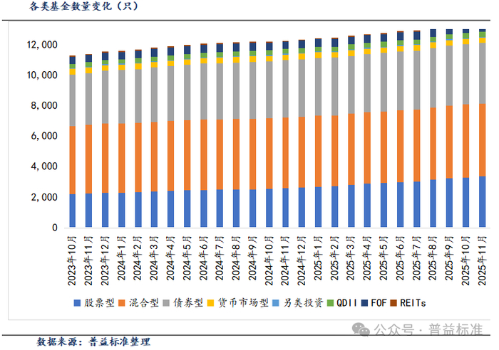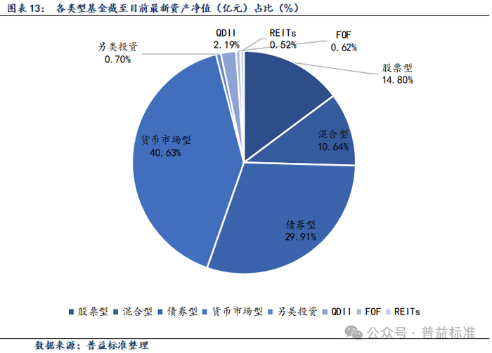 根據Wind統計數據,截至2025年11月21日,境內公募基金共有13,453只,管理資產凈值達360686億元。從各類型基金來看,股票基金共有3359只,資產凈值53385億元;混合基金共有4789只,資產凈值38381億元;債券基金共3957只,資產凈值107873億元;貨幣基金數量為362只,資產凈值146540億元;另類投資基金58只,資產凈值2530億元;QDII基金有321只,資產凈值7885億元;FOF基金529只,資產凈值2220億元;REITs基金78只,資產凈值1875億元。