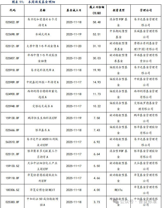 本周共成立基金30只,發行份額306.77億份。其中,股票型基金14只,發行份額49.66億份;混合型基金9只,發行份額71.77億份;債券型基金3只,發行份額113.64億份;QDII基金1只,發行份額2.57億份;REITs基金1只,發行份額4.00億份;FOF基金2只,發行份額65.12億份。本周新成立基金發行明細一覽: