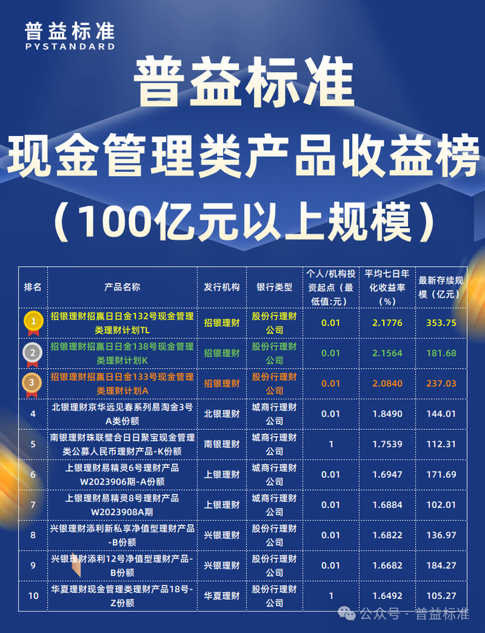 總體規(guī)模在100億元以上的現(xiàn)金管理類產(chǎn)品中,招銀理財(cái)招贏日日金132號(hào)現(xiàn)金管理類理財(cái)計(jì)劃TL平均7日年化收益率為2.1776%,排名第一;招銀理財(cái)招贏日日金138號(hào)現(xiàn)金管理類理財(cái)計(jì)劃K平均7日年化收益率為2.1564%,排名第二;招銀理財(cái)招贏日日金133號(hào)現(xiàn)金管理類理財(cái)計(jì)劃A平均7日年化收益率為2.0840%,排名第三。