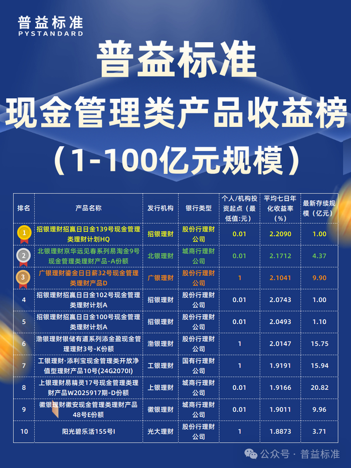 總體規(guī)模在1-100億元的現(xiàn)金管理類產(chǎn)品中,招銀理財(cái)招贏日日金139號(hào)現(xiàn)金管理類理財(cái)計(jì)劃HQ平均7日年化收益率為2.2090%,排名第一;北銀理財(cái)京華遠(yuǎn)見春系列易淘金9號(hào)現(xiàn)金管理類理財(cái)產(chǎn)品-A份額平均7日年化收益率為2.1712%,排名第二;廣銀理財(cái)鎏金日日薪32號(hào)現(xiàn)金管理類理財(cái)產(chǎn)品D平均7日年化收益率為2.1041%,排名第三。