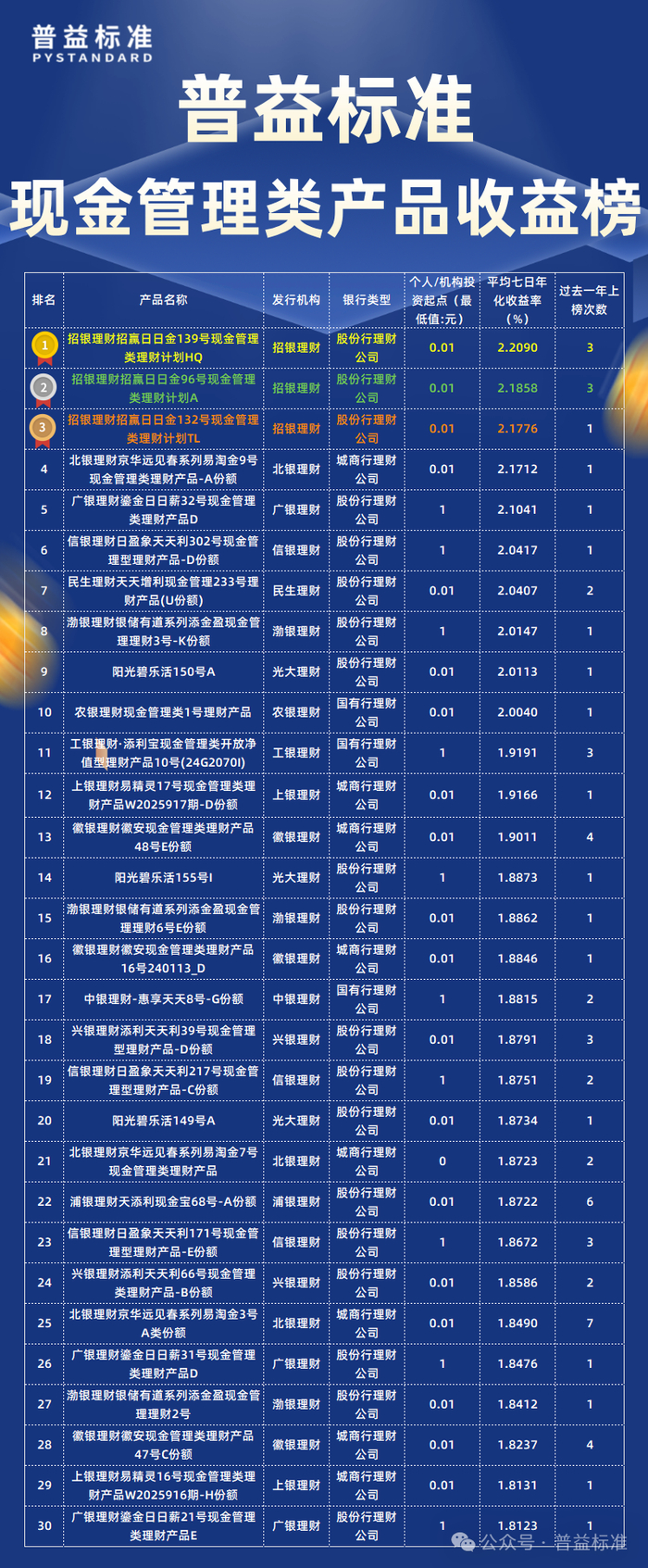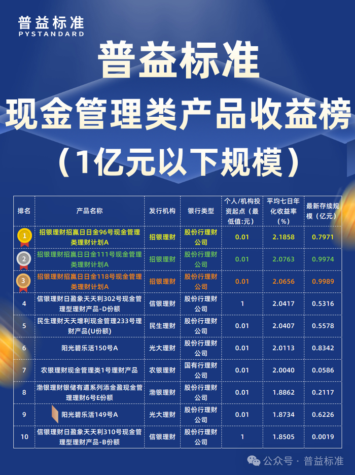 總體規(guī)模在1億元以下的現(xiàn)金管理類產(chǎn)品中,招銀理財(cái)招贏日日金96號(hào)現(xiàn)金管理類理財(cái)計(jì)劃A平均7日年化收益率為2.1858%,排名第一;招銀理財(cái)招贏日日金111號(hào)現(xiàn)金管理類理財(cái)計(jì)劃A平均7日年化收益率為2.0763%,排名第二;招銀理財(cái)招贏日日金118號(hào)現(xiàn)金管理類理財(cái)計(jì)劃A平均7日年化收益率為2.0656%,排名第三。
