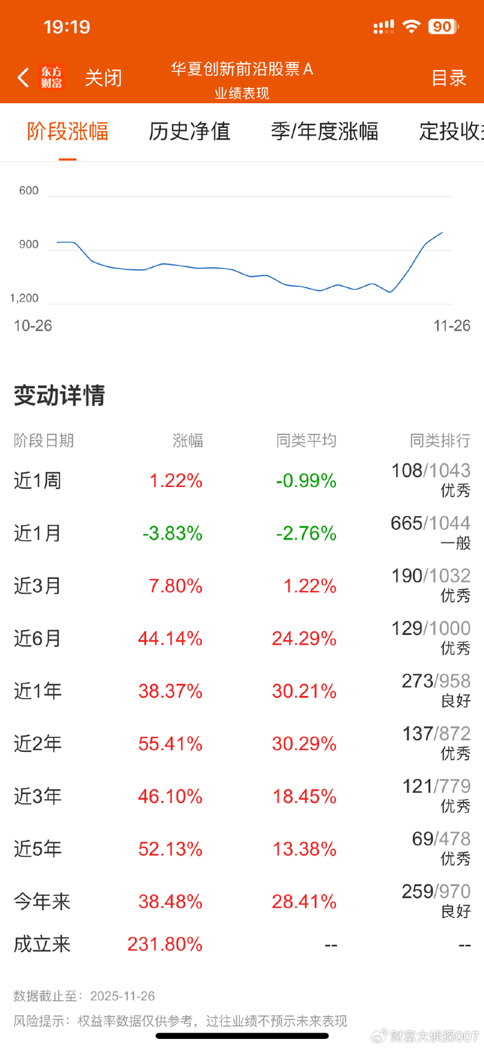 今天來分享的這只產品是——華夏創新前沿(002980),這是華夏金基金經理屠環宇管理的產品。這只基金成立時間超過9年,目前來看,成立以來業績漲了231.8%,目前累計凈值3.318元,成立以來業績還不錯,經歷了很多輪牛熊,凈值漲2倍多,不算少了吧。并且這只產品的業績長期短期中期業績都算是很不錯的,前兩三年市場大跌,這只產品業績也遠超同類平均,最近半年業績也很好。整體來看基金經理的投研水平還是不錯的。