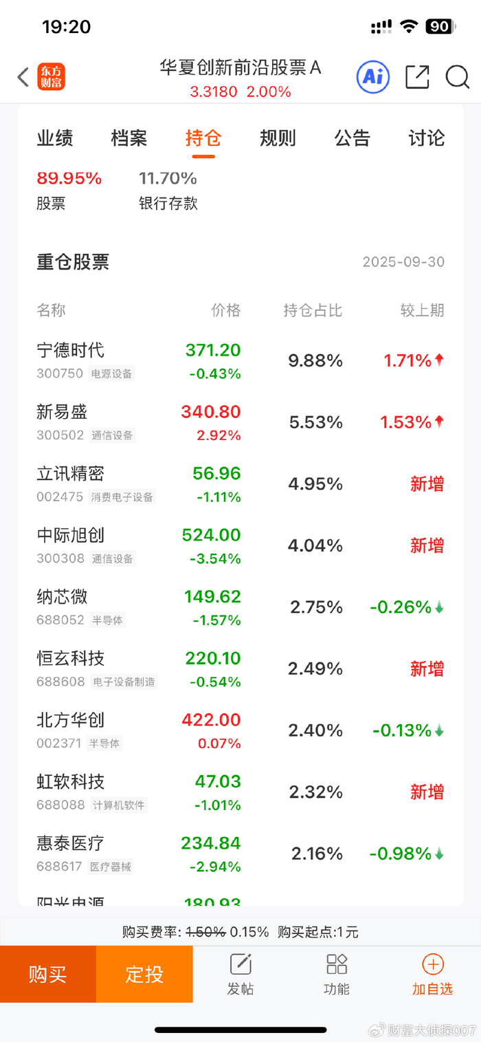 我們來看看2025年3季度末這個基金的持倉情況,主要持有的股票有:寧德時代、新易盛、立訊精密、中際旭創、納芯微、恒玄科技、北方華創和虹軟科技等。電源設備、通信設備和電子產業鏈為主,很精準的牛市板塊。