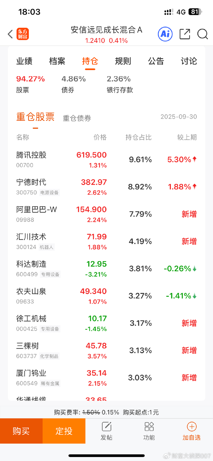 我們來看看2025年3季度末這個基金的持倉情況,主要持有的股票有:騰訊控股、寧德時代、阿里巴巴、匯川技術、科達制造、農夫山泉和徐工機械等。行業不算特別集中,但是明星個股很多。