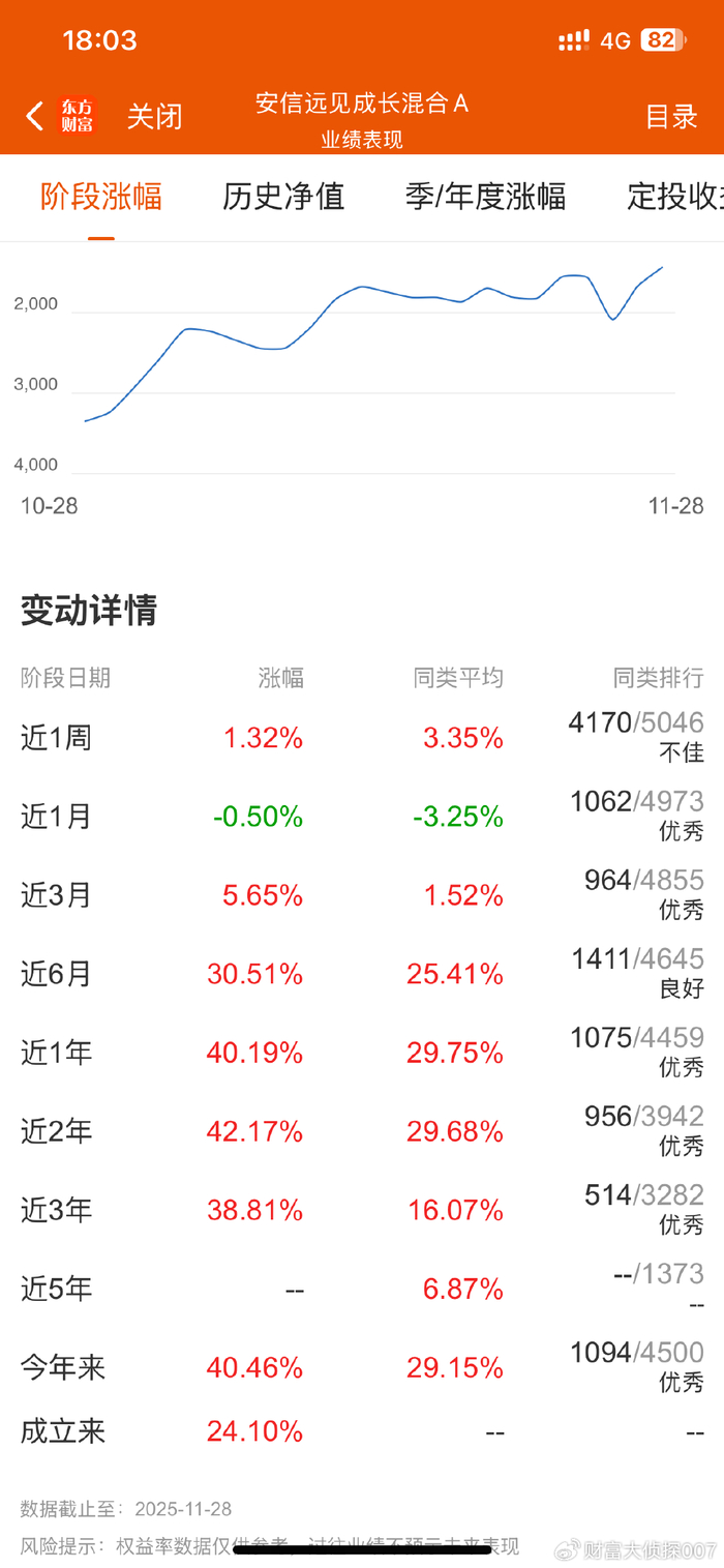 首先是成立以來漲了24.1%。今年來漲了40.46%,同類平均漲了29.15%,排名1094/4500,排名優秀。近3年漲了38.81%,同類平均漲了16.07%,排名514/3282,排名優秀。近2年漲了42.17%,同類平均漲了29.68%,排名956/3942,排名優秀。近1年漲40.19%,同類平均賺了29.75%,排名1075/4459,排名優秀。近6月漲了30.51%,同類平均漲了25.41%,排名1411/4645,排名良好。