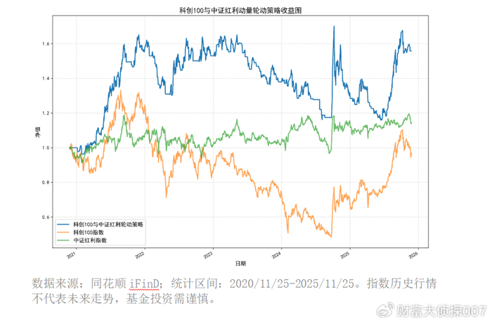 采用雙因子加權動量評分系統對比科創100和中證紅利的動量差異,其中近20日漲幅權重50%,近5日漲幅同樣權重50%。這種設計既考慮了中長期趨勢的穩定性,又兼顧了短期動量的敏感性。當某一指數的動量評分顯著領先時,策略調倉至該指數;當兩者動量評分均為負值時,策略將保持空倉,等待更好的入場時機。