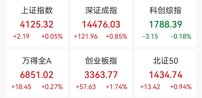 中新經緯3月11日電 11日上午,A股震蕩走高,創業板指領漲。截至午盤,上證指數漲0.05%,報4125.32點;深證成指漲0.85%,報14476.03點;創業板指漲1.74%,報3363.77點。