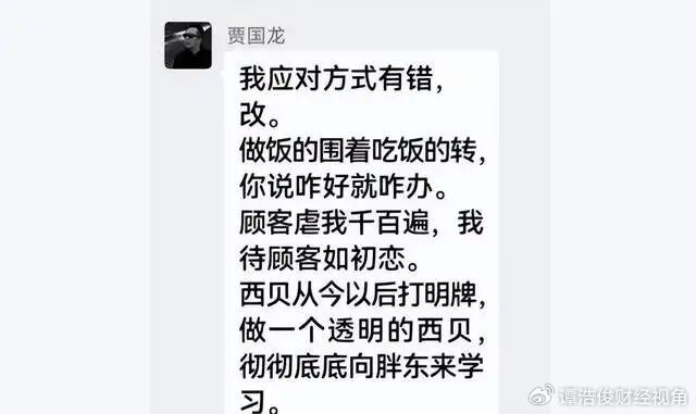 道歉信還說,做飯的圍著吃飯的轉,你說咋好就咋辦。顧客虐我千百遍,我待顧客如初戀。西貝從今以后打明牌,做一個透明的西貝。徹徹底底向胖東來學習。