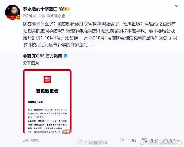 沒有想到的是,就在西貝公開道歉信發出沒多長時間,羅永浩又耐不住了,對西貝的致歉信提出質疑。羅永浩回應西貝致歉信稱:顧客虐你什么了?顧客都被你打成網絡黑社會了,誰虐誰呢?百分之百沒有預制菜的虛假承諾呢?拿預制菜假裝不是預制菜的稅率差異呢,要不要給公眾攤開講講?10月1號開始替換,所以你10月1號前還要繼續賣剩菜是嗎?加了很多科技狠活兒腥氣撲鼻的海鱸魚呢……