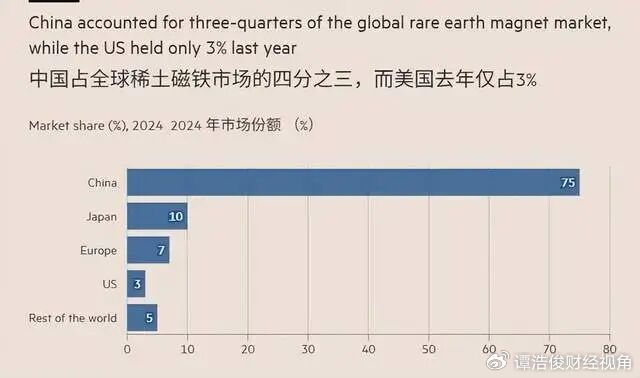 報道強調,中國控制著全球約70%的稀土產量,這些稀土被用于電動汽車、風力發電和工業機器人電機等各個領域。對于某些稀土,中國幾乎控制了全部供應。