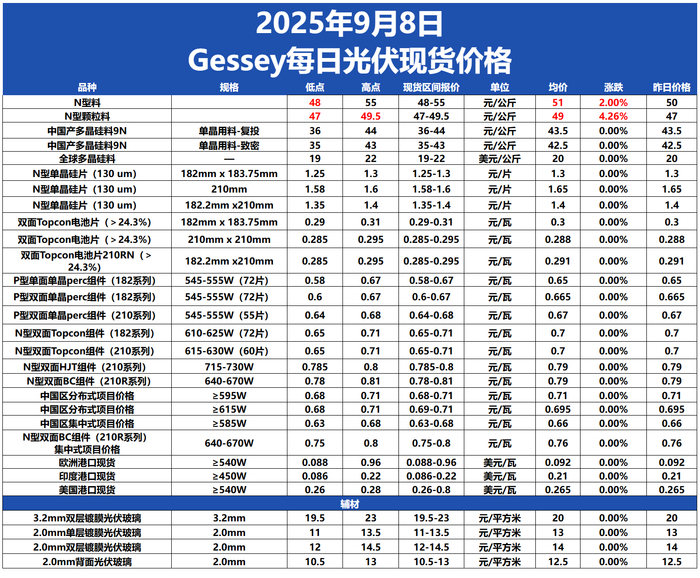 今日硅料價格小幅上漲,N型料主流價格在48-55元/公斤,均價51元/公斤,上漲2%。N型顆粒硅主流價格在47-49.5元/公斤,均價49元/公斤,上漲4.26%。基于收儲央預期硅料企業通過并購關停落后產能即將落地,另外疊加能耗指標收緊后續新增產能有效控制,以及配套預期后續硅料有效產能縮減導致的成本上升,硅料企業報價上周進一步上調至55元/公斤,今日均價整體上浮,顆粒硅最新成交均價達到49元/公斤,訂單排產可至國慶后,而N型棒硅最新均價維持51元/公斤。