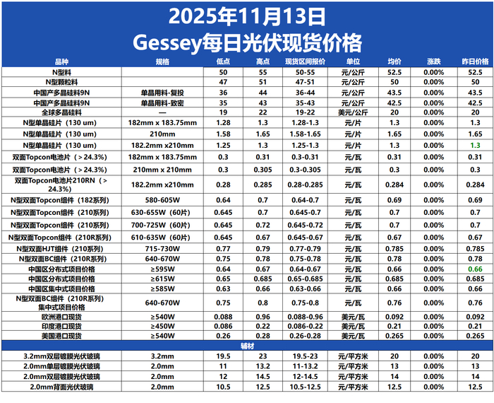 今日組件價格整體維穩,N型雙面Topcon?組件(182系列)價格在0.64-0.7元/?瓦,均價為0.69元/瓦。N型雙面Topcon?組件(210系列)價格在0.645-0.7元/?瓦,均價為0.7元/瓦。N型雙面Topcon組件(210系列)(700-725W(60片)價格在0.645-0.72元/?瓦,均價為0.7元/瓦。N型雙面Topcon組件(210R系列)(610-635W(60片))價格在0.645-0.67元/?瓦,均價為0.67元/瓦。N型雙面HJT組件(210系列)價格在0.77-0.79元/?瓦,均價為0.785元/瓦。N型雙面BC組件(210R系列)價格在0.75-0.78元/?瓦,均價為0.78元/瓦。中國區分布式項目(≥595W)價格在0.64-0.67元/瓦,均價為0.66元/瓦。中國區分布式項目(≥615W)價格在0.65-0.685元/瓦,均價為0.685元/瓦,中國區集中式項目(≥585W)價格在0.63-0.66元/?瓦,均價為0.66元/瓦。N型雙面BC組件(210R系列)集中式項目價格在0.75-0.8元/?瓦,均價為0.76元/瓦。歐洲港口現貨價格在0.088-0.96美元/?瓦,均價為0.092美元/瓦。印度港口現貨價格在0.086-0.22美元/?瓦,均價為0.21美元/瓦。美國港口現貨價格在0.26-0.28美元/?瓦,均價為0.265美元/瓦。