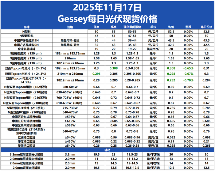 今日組件價格整體維穩,N型雙面Topcon?組件(182系列)價格在0.64-0.7元/?瓦,均價為0.69元/瓦。N型雙面Topcon?組件(210系列)價格在0.645-0.7元/?瓦,均價為0.7元/瓦。N型雙面Topcon組件(210系列)(700-725W(60片)價格在0.645-0.72元/?瓦,均價為0.7元/瓦。N型雙面Topcon組件(210R系列)(610-635W(60片))價格在0.645-0.67元/?瓦,均價為0.67元/瓦。N型雙面HJT組件(210系列)價格在0.77-0.79元/?瓦,均價為0.785元/瓦。N型雙面BC組件(210R系列)價格在0.75-0.78元/?瓦,均價為0.78元/瓦。中國區分布式項目(≥595W)價格在0.64-0.67元/瓦,均價為0.66元/瓦。中國區分布式項目(≥615W)價格在0.65-0.685元/瓦,均價為0.685元/瓦,中國區集中式項目(≥585W)價格在0.63-0.66元/?瓦,均價為0.66元/瓦。N型雙面BC組件(210R系列)集中式項目價格在0.75-0.8元/?瓦,均價為0.76元/瓦。歐洲港口現貨價格在0.088-0.96美元/?瓦,均價為0.092美元/瓦。印度港口現貨價格在0.086-0.22美元/?瓦,均價為0.21美元/瓦。美國港口現貨價格在0.26-0.28美元/?瓦,均價為0.265美元/瓦。