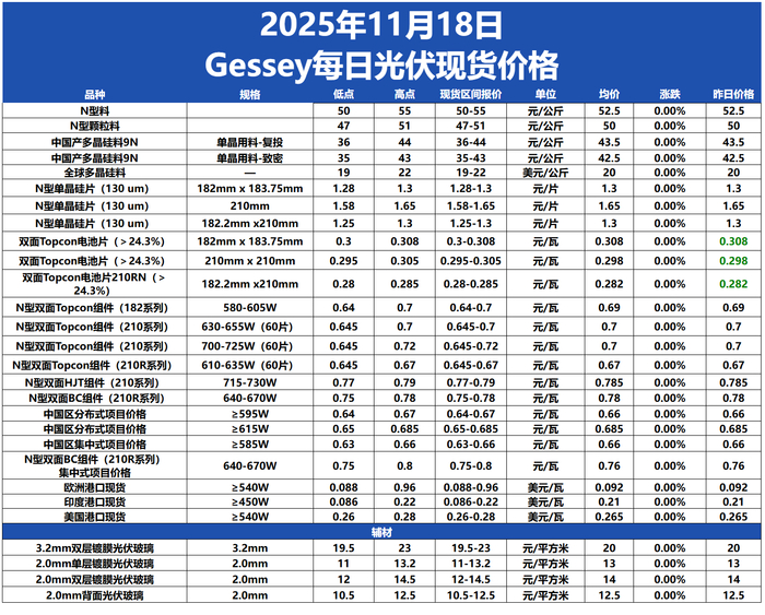 今日組件價格整體維穩,N型雙面Topcon?組件(182系列)價格在0.64-0.7元/?瓦,均價為0.69元/瓦。N型雙面Topcon?組件(210系列)價格在0.645-0.7元/?瓦,均價為0.7元/瓦。N型雙面Topcon組件(210系列)(700-725W(60片)價格在0.645-0.72元/?瓦,均價為0.7元/瓦。N型雙面Topcon組件(210R系列)(610-635W(60片))價格在0.645-0.67元/?瓦,均價為0.67元/瓦。N型雙面HJT組件(210系列)價格在0.77-0.79元/?瓦,均價為0.785元/瓦。N型雙面BC組件(210R系列)價格在0.75-0.78元/?瓦,均價為0.78元/瓦。中國區分布式項目(≥595W)價格在0.64-0.67元/瓦,均價為0.66元/瓦。中國區分布式項目(≥615W)價格在0.65-0.685元/瓦,均價為0.685元/瓦,中國區集中式項目(≥585W)價格在0.63-0.66元/?瓦,均價為0.66元/瓦。N型雙面BC組件(210R系列)集中式項目價格在0.75-0.8元/?瓦,均價為0.76元/瓦。歐洲港口現貨價格在0.088-0.96美元/?瓦,均價為0.092美元/瓦。印度港口現貨價格在0.086-0.22美元/?瓦,均價為0.21美元/瓦。美國港口現貨價格在0.26-0.28美元/?瓦,均價為0.265美元/瓦。