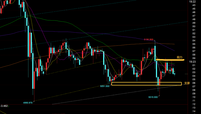 第二,黃金小時線級別:一早開盤的確先續漲了一波,靠近5200下出現沖高回落,本身那里提示只有阻力的,回落一下子擊穿了上周五低點,最低5015再出現探底拉升,而拉升又刺穿了日內618分割阻力5125-27,最高5140承壓回落至5085;所以,針對短期的震蕩方向,其實不難判斷,基本都是正確的,但它在關鍵支撐或阻力觸及后,時不時容易出現慣性上拉點或下穿點的動作,這就會導致短線的防守容易出現刺破掃盤;對于美盤來講,首先亞盤下跌一波,歐盤仍處于一定壓制整理,美盤大概率還會震蕩,并且會有二次下探;其次,短周期macd基本早完成了下行動能,都已轉為看漲的形態,處于醞釀之中,所以拉低是容易探底拉升的;那么,阻力還是618分割位置5125-27之下,支撐關注日內反彈的618位置5062,以及通道下軌支撐5050,若慣性擊穿下行,只要收盤探底拉升長下影K回到通道之內,那么支撐依然是有效的;傾向于今晚探底拉升震蕩。 (若小概率出現砸盤失守5000關口了,也不要慌,4870-80上具備較大買盤,下去了也預計曇花一現,很快會回升,敢出好的低位,就要敢于炒底)