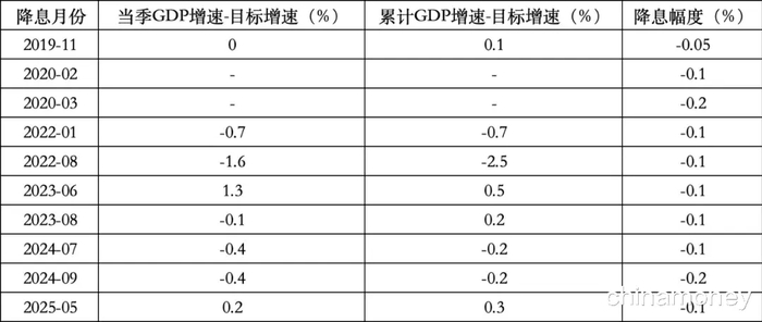 這10次降息里,8次降息當季GDP增速低于或等于當年目標值,但有兩次例外。一次是2023年6月,當時的背景是,二季度GDP同比高增速主要受低基數拉動,而兩年年均復合增速僅為3.3%,該復合增速保持到年底則當年GDP的同比增速只有4.3%,低于“5%左右”的目標。另一次是2025年5月,背景是美國政府4月宣布“對等關稅”,根據當時的關稅水平和市場測算,出口和經濟面臨較大下行壓力,GDP增速可能下滑1~2個百分點,有較大概率跌破目標。